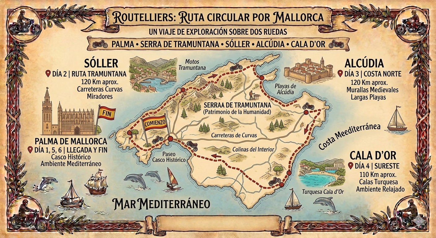Discover the gem of the Mediterranean, riding the legendary curves of the Tramuntana Mountains and the spectacular serpentine descent to Sa Calobra. A journey of contrasts, blending crystal-clear coves with breathtaking mountain passes. Experience the soul of the island in every turn of this route, designed for those who love great weather, the sea, and life on two wheels.