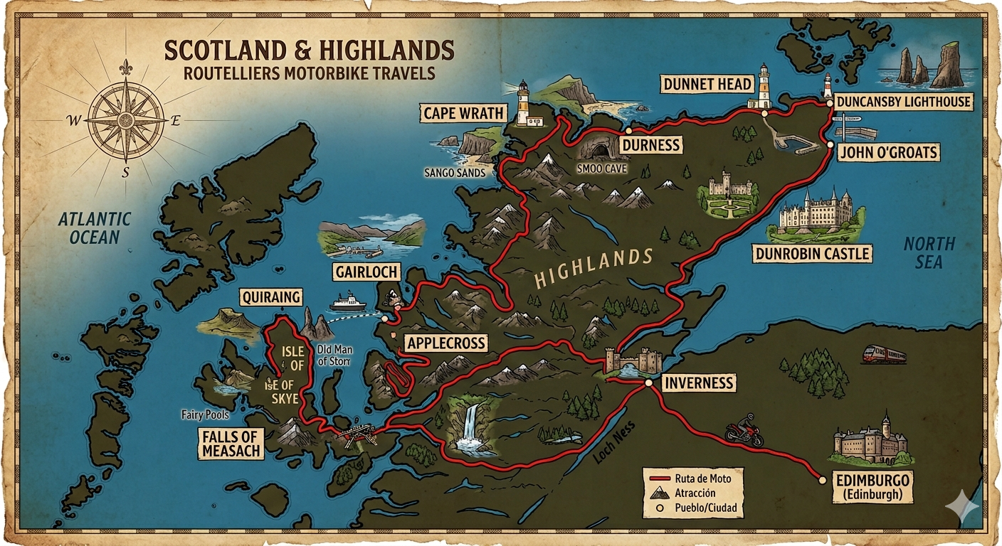 Tras un cómodo trayecto en tren hasta Inverness, recogida de la moto y ajuste de maletas. Tiempo para familiarizarse con la moto y planificación de la ruta. Noche en Inverness.