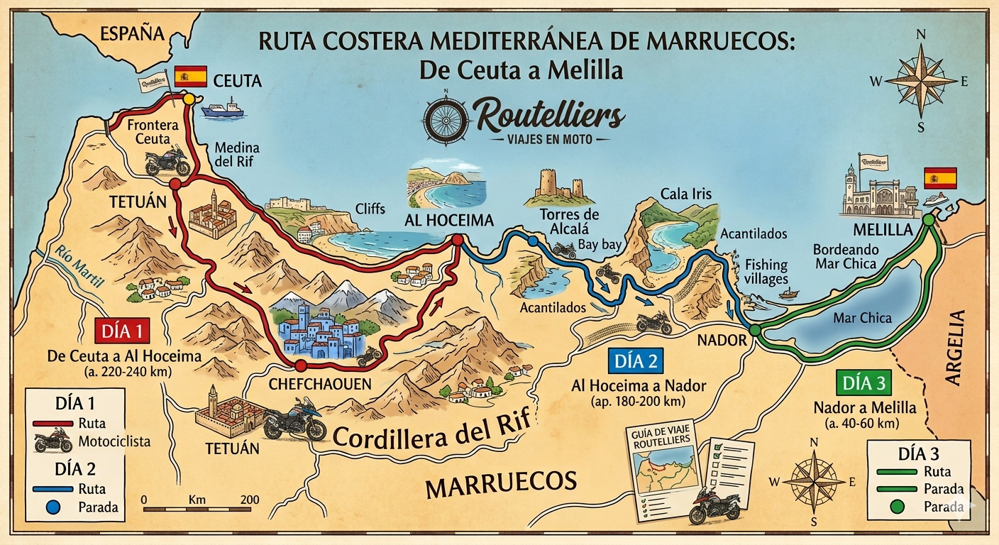 Tras cruzar la frontera en Ceuta comienza la aventura recorriendo las montañas del Rif. La ruta pasa por la histórica ciudad de Tetuán antes de adentrarse en el espectacular paisaje montañoso que conduce a Chefchaouen, el famoso pueblo azul de Marruecos. Desde allí la carretera continúa hacia la costa mediterránea hasta llegar a Al Hoceima, una ciudad costera con impresionantes vistas al mar.